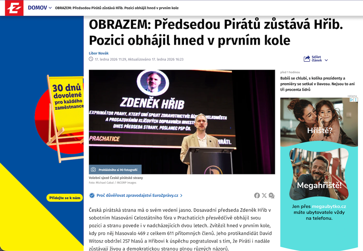 EuroZprávy.cz - Pirate Party Chair Zdeněk Hřib Reelected in First Round, January 17, 2026 - Link